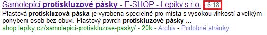 Zdravím, snažím se pomáhat s optimalizací webu lepíky na kw protiskluzové pásky a na google mě dneska zarazilo malé číslícko u jednoho z výsledků vyhledávání viz obrázek. Nevíte co to číslo znamená? Čas čeho? Ostatní odkazy ho tam neměly. Je to nějaký čas mojí návštěvy toho odkazu, či co? Nebo jsem se zbláznil a nic tam neni? :)