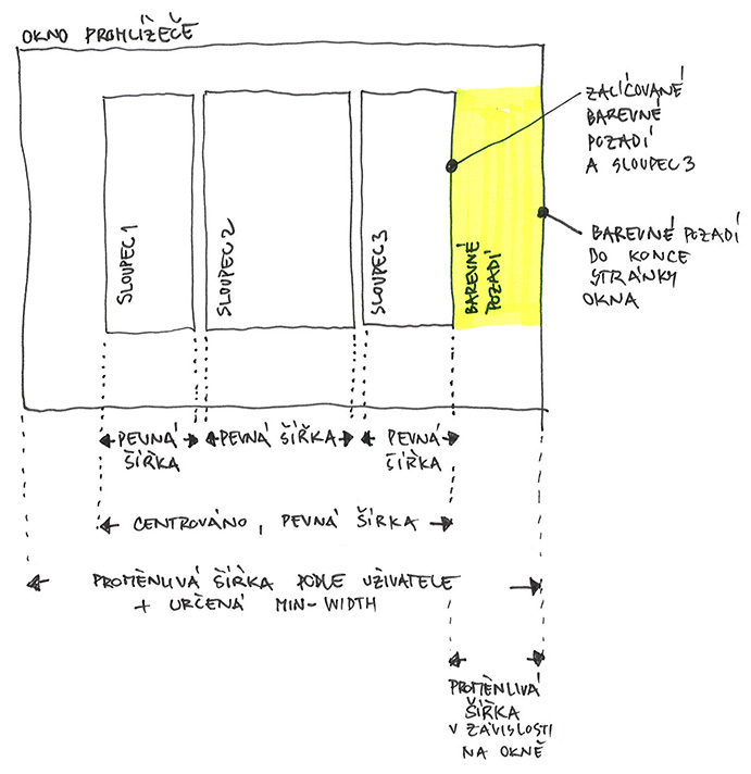 mám problém správně napozicovat prvek v třísloupcovým layoutu. Prosím mrkněte na nákres. Jedná se mi o vyznačené barevné pozadí, které potřebuji zarovnat se "sloupcem 3" a zároveň s koncem okna prohlížeče. Fungovat by to mělo i v případě, kdy uživatel mění šířku okna. Body má nadefinované min-width, aby byla zaručena minimální šířka "barevného pozadí". Snad je to jenom prkotina, ale nepřišel jsem na to. Děkuji.