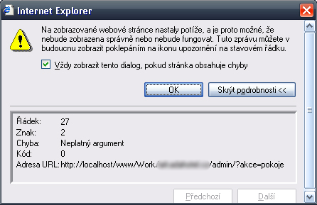 mám problém s otevíráním popup oken v IE (6 i 7). Používám tento kód: JS: 24. function popup(url, wid, hei) { 25. left = (window.screen.availWidth-wid)/2; 26. shora = (window.screen.availHeight-hei)/2; 27. window.open(url,url,"left="+left+",top="+shora+",scrollbars=yes,resiza ble=no,toolbar=no,menubar=no,status=no,location=0,width="+wid+",height ="+hei); 28. } HTML: <a href="#" onclick="popup('soubor.php?id=1', 400, 400);">Editovat</a> Ve FF to funguje, ale IE při kliknutí na odkaz hodí tohle. Nemáte s tím někdo zkušenosti? |